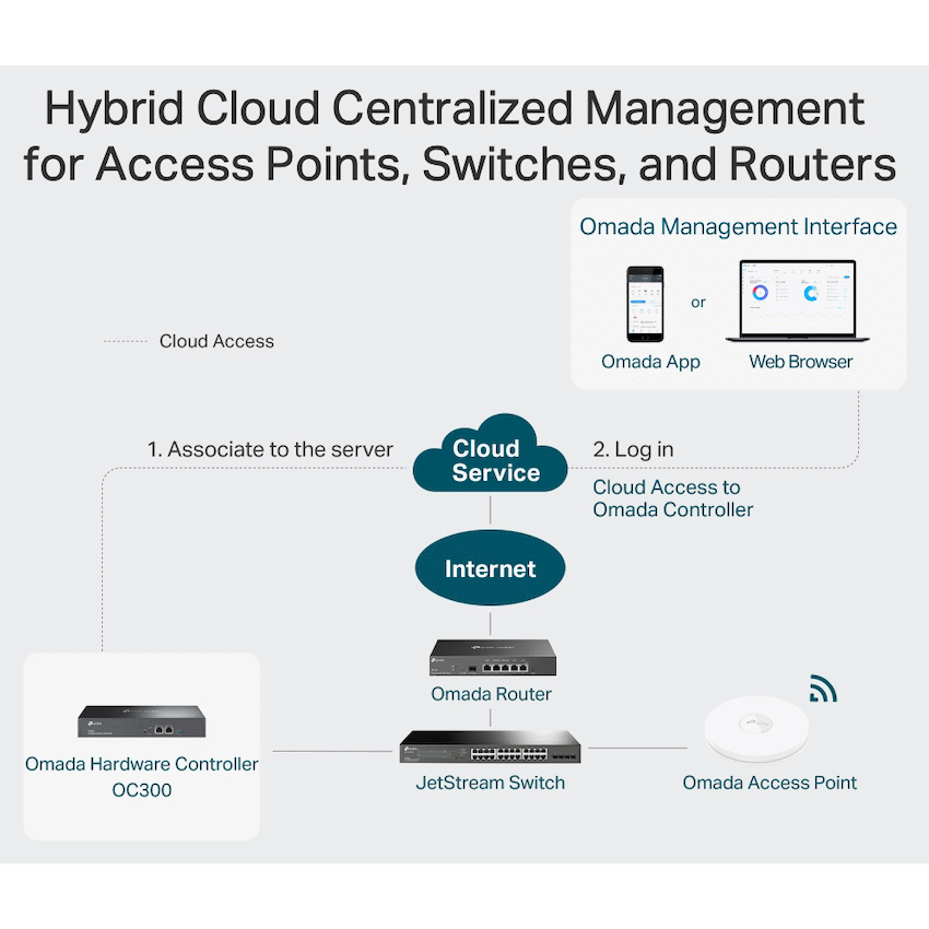 TP-Link Omada OC300 Omada Hardware ControllerCentralized management for up to 500 Omada access points, JetStream switches, and SafeStream routers.Cloud access to manage from anywhere, anytime.Locally monitor and manage devices with the ultimate security and stability.The Omada app for convenient management.Industry-leading hardware design with a powerful chipset, durable metal casing, and USB 3.0 port for auto backup.Batch management, multi-site management, and remote firmware updates benefit network maintenance.The easy-to-use dashboard makes it easy to see your real-time network status and check network usage and traffic distribution.Network topology helps IT admins quickly see and troubleshoot connections at a glance.